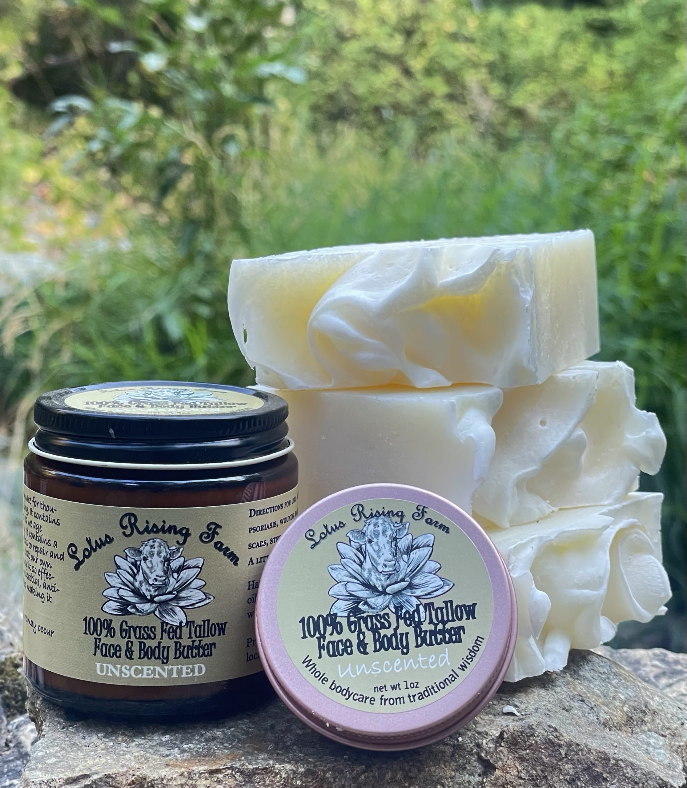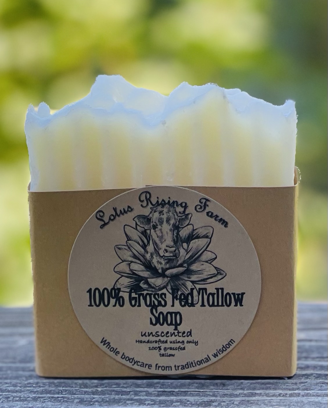 Lotus Rising Farm’s soap is handcrafted using the traditional method of cold processing which takes a month to cure and creates a hard long lasting bar of soap. Tallow soap gives a creamy lather and leaves the skin feeling luxuriously soft. Pair it with Lotus Rising Farm’s 100% Grass Fed Tallow Face and Body Butter for a deeply moisturizing treatment that will leave a long lasting softness like nothing you’ve ever tried! Can double as a shampoo bar!