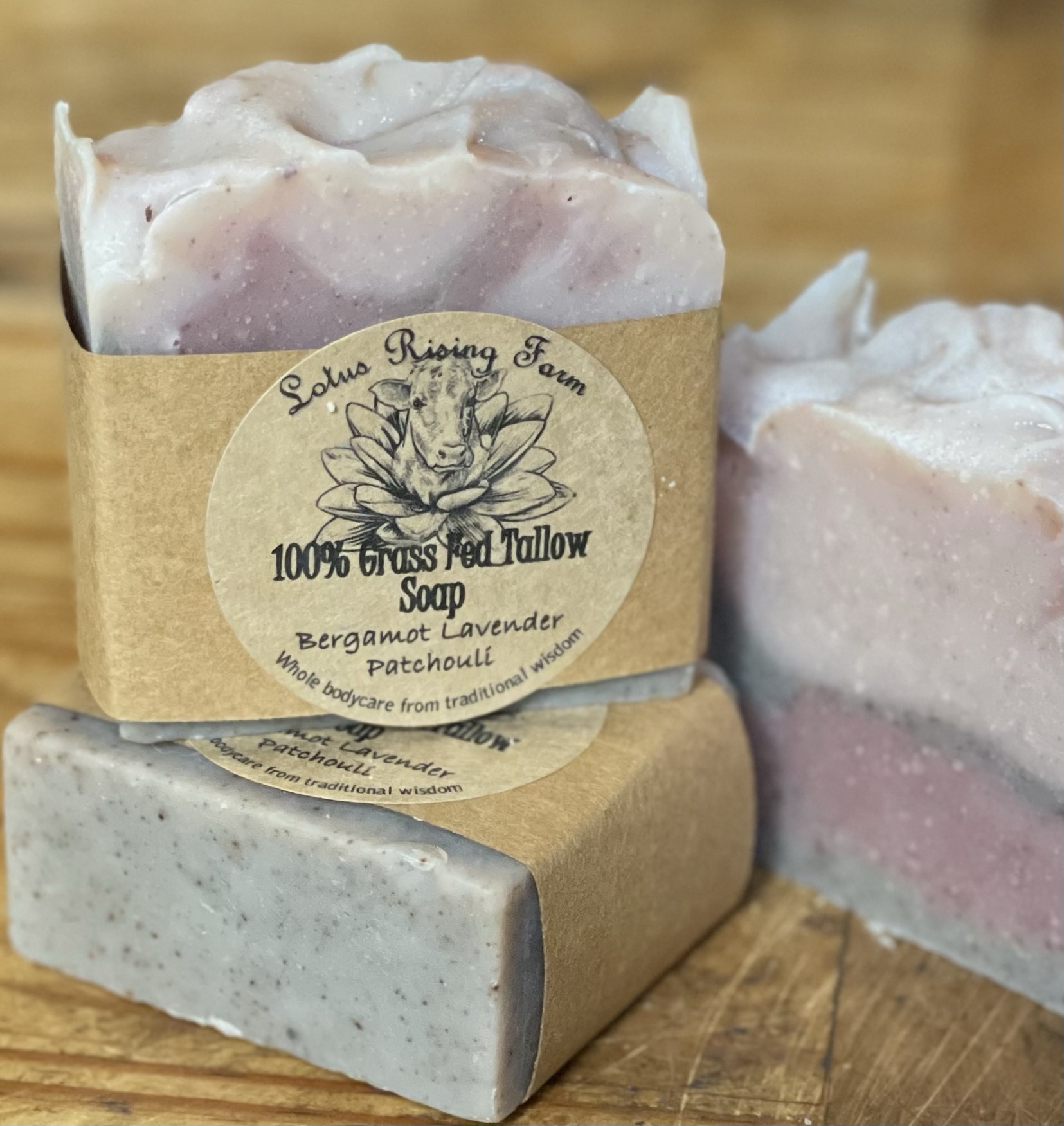 100% grass fed tallow scented with essential oils of Bergamot, Lavender and just a touch of Patchouli. Botanicals of Madder Root, Alkanet and Indigo were used to create varying colors of mauves, lavender and periwinkle.