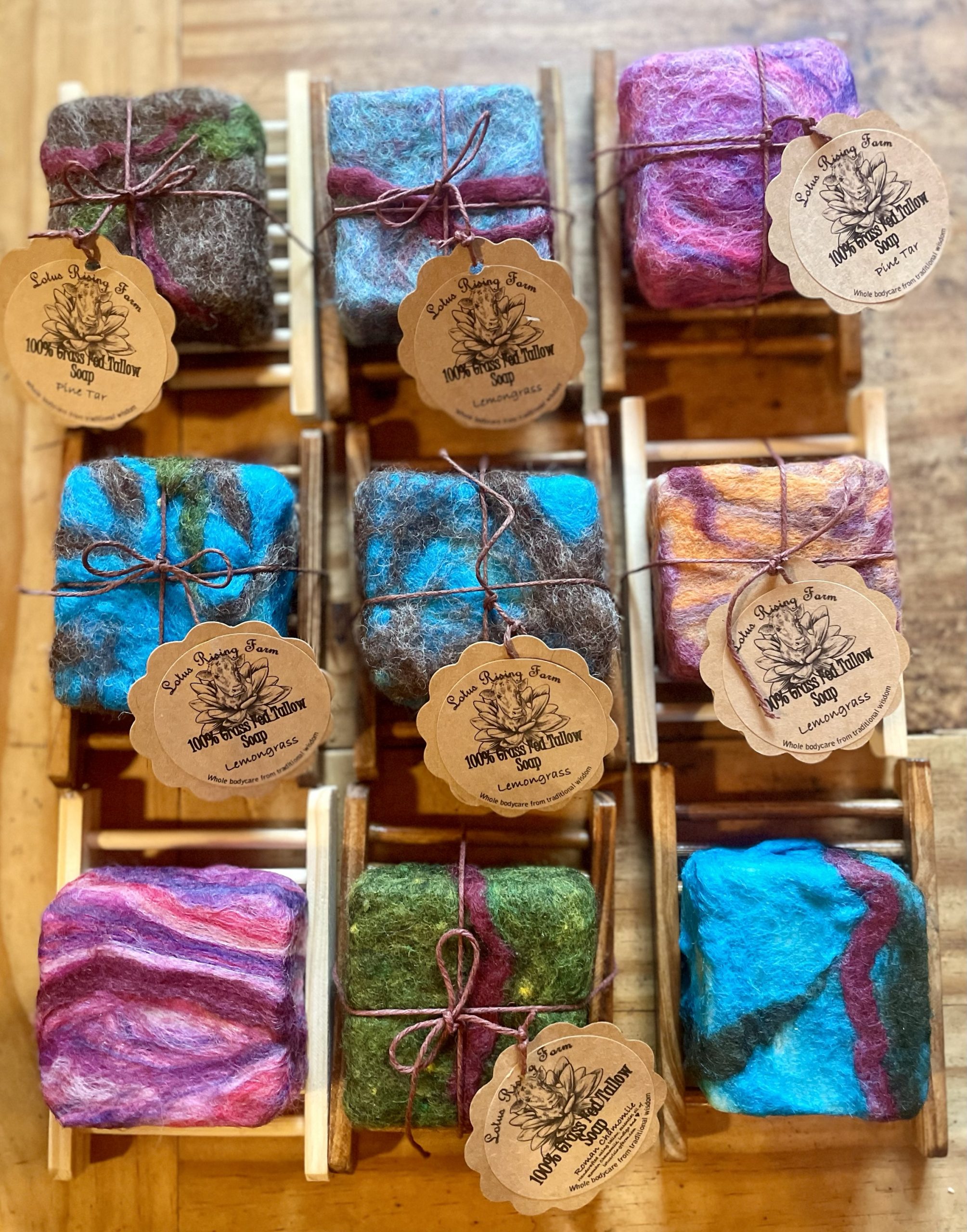 Looking for a way to make your already extra long lasting cold processed tallow soap, last longer? Then felted soap is the way to go! Each bar is handcrafted and unique in its’ design and color scheme and not only does felted wool create a much longer lasting bar of soap, but it also adds a gentle exfoliation to your wash. Each felted soap comes with a bamboo soap rack, making it a beautiful gift for your loved ones!