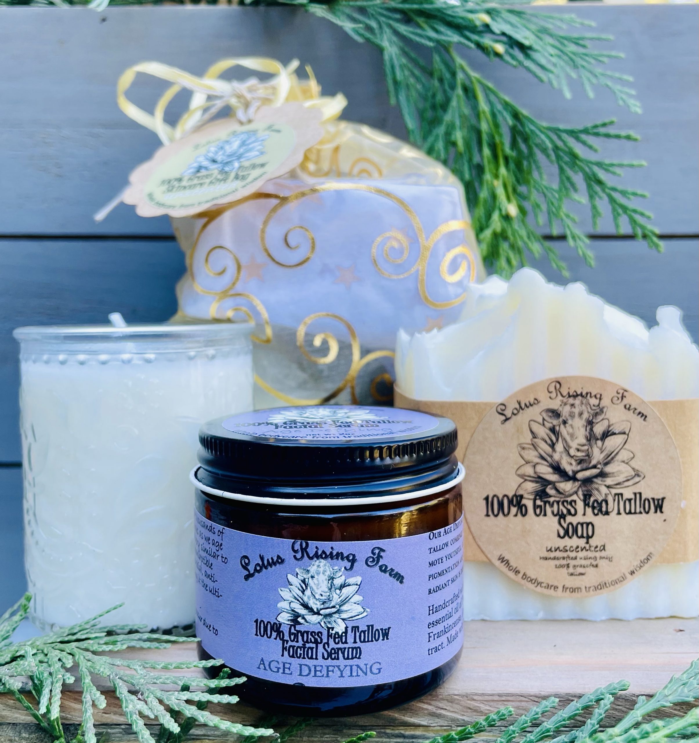 1-2oz jar of Age Defying tallow face and body butter, 1 bar of tallow soap, 1 unscented tallow candle in a pretty organza bag.
