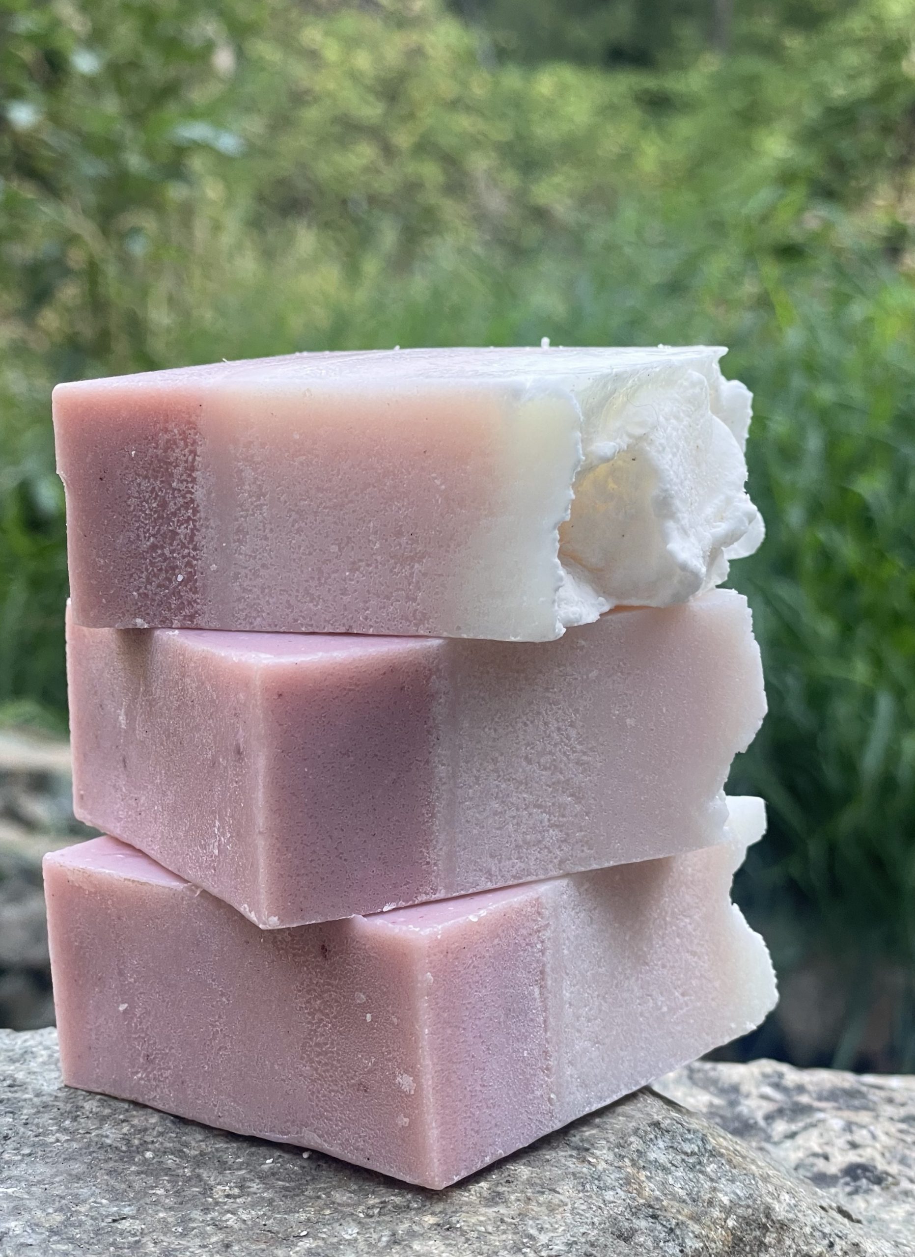 This lovely smelling petal pink soap combines the essential oil of Rose Geranium with the soft pink hues of rose clay in a 100% grass fed tallow base for the ultimate pink beauty!