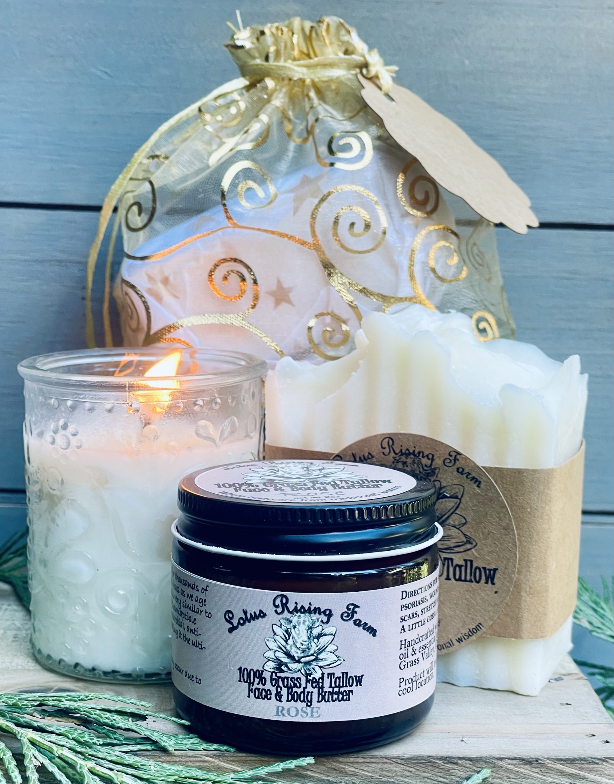 1-2oz jar of rose face and butter, 1 bar of tallow soap, 1 unscented tallow candle in a pretty organza bag.