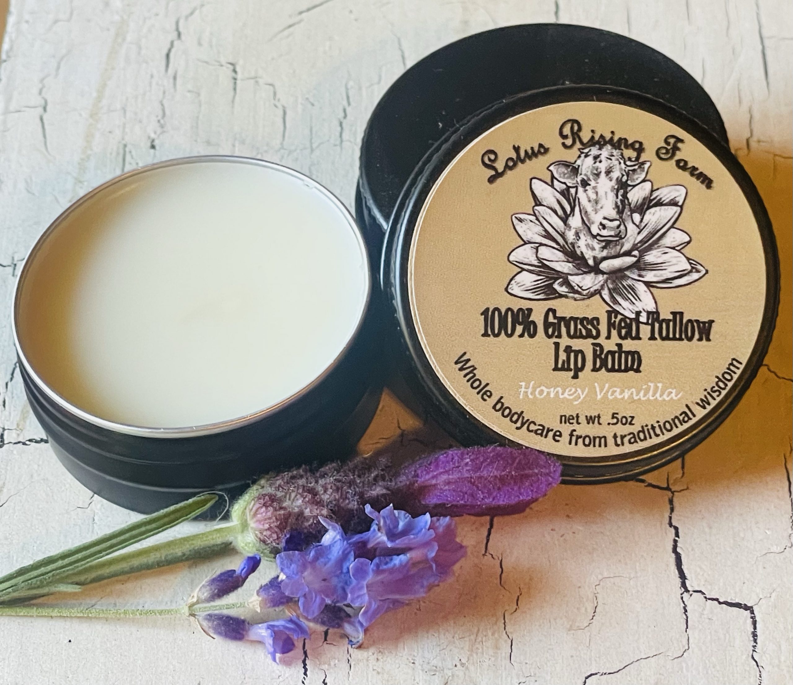 This lip balm combines the super hydrating healing properties of tallow with the delicious scent of Vanilla essential oil for a soothing balm that will leave your lips soft and supple and help prevent and reverse cracked dry lips, signs of aging and cold sores.